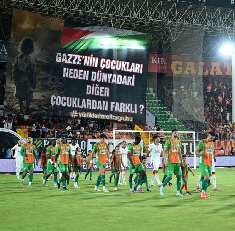Trendyol Süper Lig 7. hafta müsabakasında Corendon Alanyaspor alanında Galatasaray’a 1-0’lık skorla mağlup oldu. Alanyasporlu taraftarlar müsabakada İsrail’in soykırımına maruz kalan Filistin’i unutmadı.