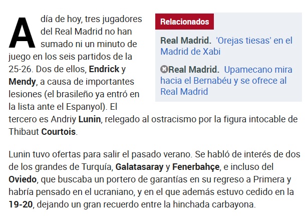 Lunin ile ilgilenen bir diğer kulübün ise La Liga gruplarından Real Oviedo olduğu söz edildi. 26 yaşındaki oyuncunun, yaz ayrlarında gruptan ayrılması için teklifler almasına ve Courtois’nın da yerinin garanti olduğunu bilmesine karşın Real Madrid’de kalmaya karar verdiği öğrenildi.