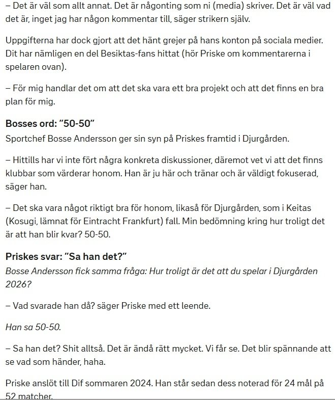Djurgarden Sportif Yöneticisi Bosse Andersson’un Priske’nin geleceğine dair yaptığı, “Takımda kalma ihtimali yüzde 50-50. Şu ana kadar rastgele bir kulüple somut görüşme yapmadık. Fakat onu bedelli bulan kulüpler olduğunu biliyoruz. Şu anda burada, idman yapıyor ve son derece odaklı.” sözleri üzerine değerlendirmelerde bulunan santrfor, “Bunu mu dedi? Vay be. 50-50 hayli yüksek bir oran. Göreceğiz. Neler olacağını görmek heyecan verici.” dedi.
