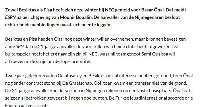 Voetbal Primeur’da yer alan habere nazaran Başar Önal, bu teklifleri reddetti. Kanat oyuncusunun NEC’de çok keyifli olduğu ve kadro arkadaşı Sami Ouaissa ile girdiği gol krallığı yarışında onu geride bırakmaya odaklandığı belirtildi.