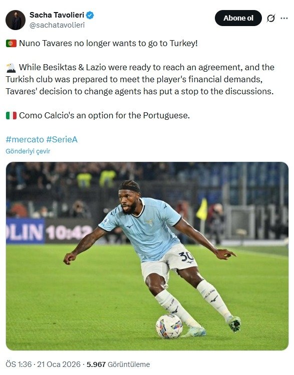 Ancak transferde flaş bir sav gündeme geldi. Belçikalı gazeteci Sacha Tavolieri’nin haberine nazaran, menajerini değiştiren Nuno Tavares Beşiktaş’a transfer olmaktan vazgeçti. Haberde Lazio ve Beşiktaş’ın muahede noktasına geldiği fakat oyuncunun karar değişikliğinin görüşmeleri durdurduğu da aktarıldı.