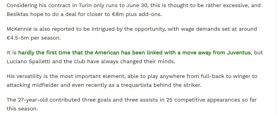 Bu dönem Juventus formasıyla 25 resmi müsabakaya çıkan McKennie, 3 gol ve 3 asistlik bir katkı sağladı. ABD’li oyuncunun piyasa kıymeti 22 milyon euro olarak gösteriliyor.