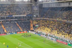 Sarı-lacivertli taraftarlar Chobani Stadyumu’nda oynanan maçta Gazze’ye dayanak olmak gayesiyle “Filistin’deki her çocuk güvenliği, sevgiyi ve geleceği hak ediyor”, “Özgür Filistin” yazılı pankartlar ve Filistin bayrağı açtı.