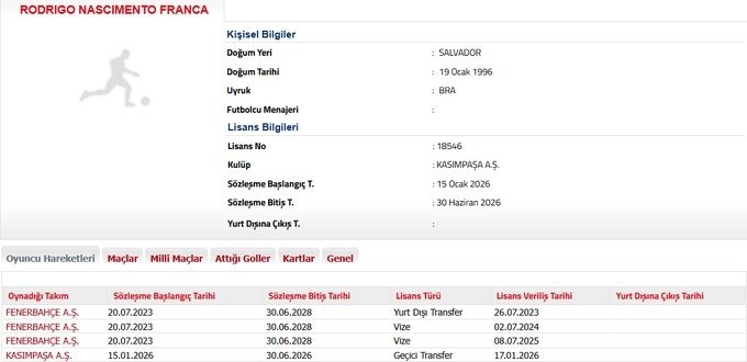 Fenerbahçe, savunma oyuncularından Rodrigo Becao’nun dönem sonuna kadar Kasımpaşa’ya kiralandığını Türkiye Futbol Federasyonu’na bildirdi.