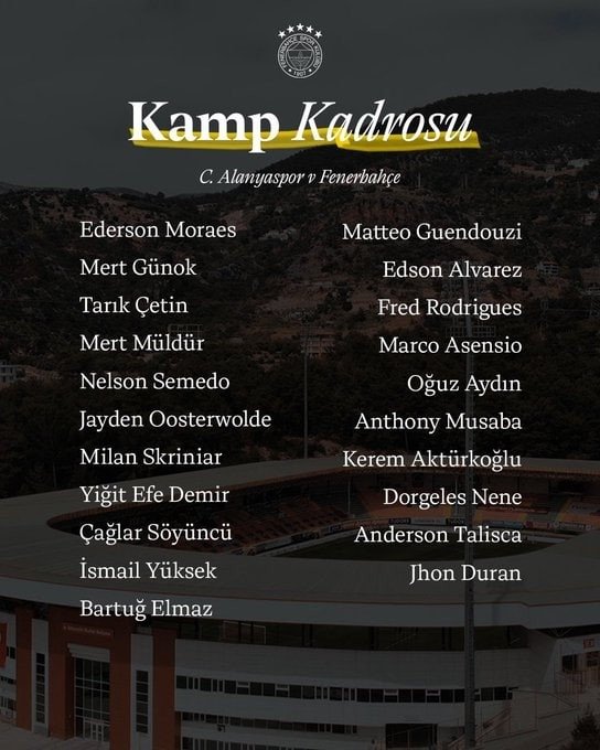 Trendyol Harika Lig’in 18. haftasında 18 Ocak Pazar günü Corendon Alanyaspor’a konuk olacak Fenerbahçe’nin kamp takımı açıklandı. Sarı-lacivertli takımda Levent Mercan, Archie Brown, Sebastian Szymanski ve Youssef En-Nesyri takımda yer almadı.