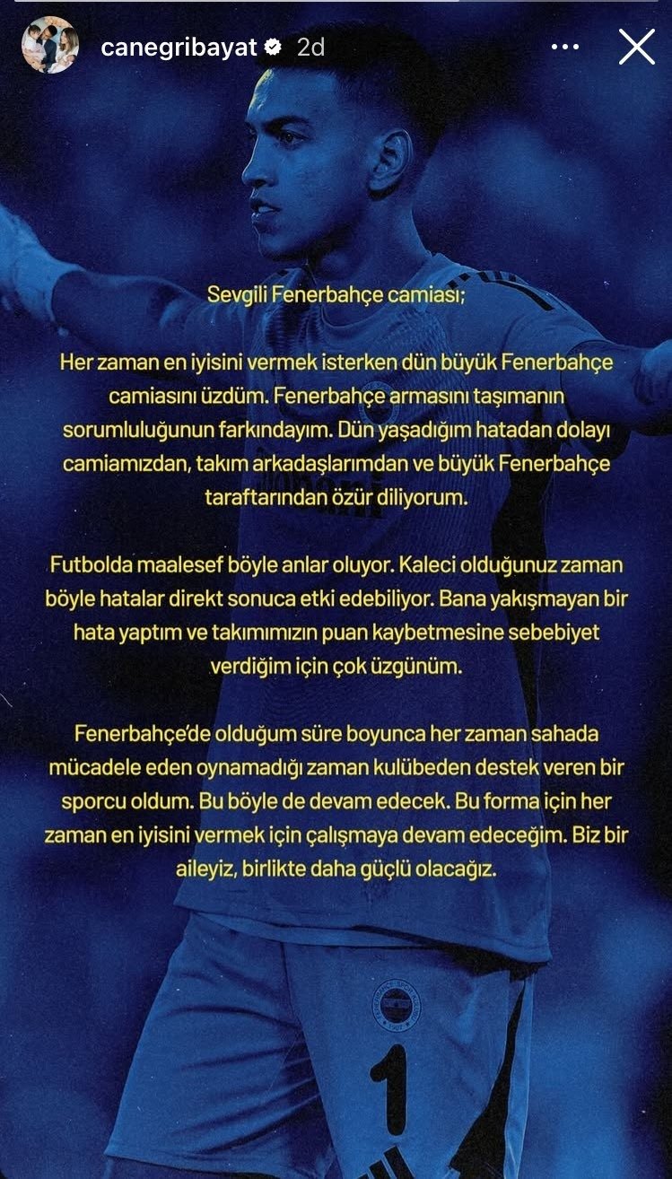Her vakit en düzgününü vermek isterken, dün büyük Fenerbahçe topluluğunu üzdüm. Fenerbahçe armasını taşımanın sorumluluğunun farkındayım. Dün yaşadığım yanılgıdan ötürü topluluğumuzdan, ekip arkadaşlarımdan ve büyük Fenerbahçe taraftarından özür diliyorum.