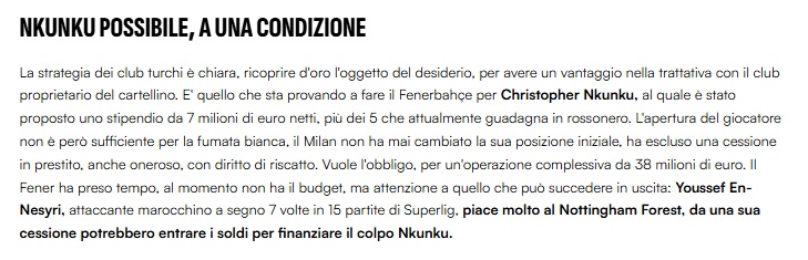 Fenerbahçe, Nkunku’yu satın alma opsiyonlu olarak kiralamak isterken Milan bu teklifi kesin bir lisanla reddetti.