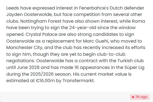 Ayrıca Leeds United’ın Oosterwolde transferi için birçok kulüple transfer rekabeti içerisine girdiği de aktarıldı.