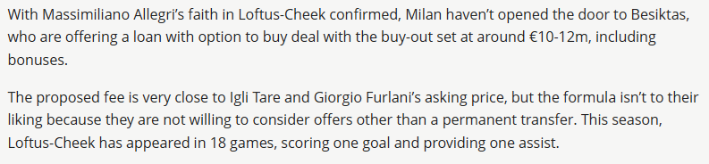 Calciomercato’nun haberine nazaran Beşiktaş, 28 yaşındaki İngiliz orta sahanın menajerlik grubuyla yine temasa geçti ve oyuncunun Milan’da kazandığı yaklaşık 4 milyon euro düzeyinin üzerine çıkmaya hazır olduğunu iletti. Lakin oyuncu cephesinden şu etapta net bir olumlu dönüş gelmedi. Ruben Loftus-Cheek’in planının dönem sonuna kadar Milan’da kalmak ve kontratının bitimine bir yıl kala geleceğini daha sakin bir ortamda pahalandırmak olduğu tabir ediliyor.