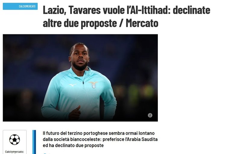 Cittaceleste.it’de yer alan habere nazaran; Nuno Tavares, Beşiktaş ve Zenit’in tekliflerini reddetti. Haberde Portekizli futbolcunun vatandaşı Sergio Conceicao’nun çalıştırdığı Al Ittihad ile muahede sağladığı ve oyuncunun kulüplerin mutabakatını beklediği yazıldı.