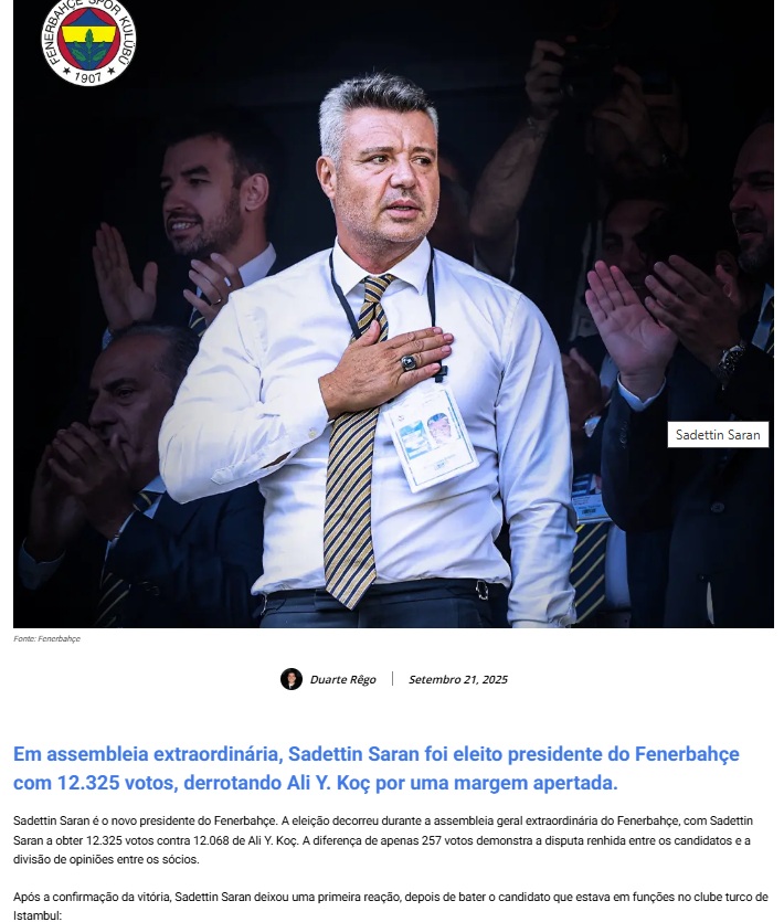 Bola na Rede’de yer alan haberde, “Sergio Conceiçao’yu vaat etti ve seçimleri kazandı: Sadettin Saran, Fenerbahçe başkanı seçildi.” başlığı kullanıldı. Saran’ın, vazifesi devraldığı anda yaptığı açıklamada, kulübün mevcut teknik yöneticisi Domenico Tedesco’nun misyonuna devam edeceğini de doğruladığı bilgisi haberde yer aldı.