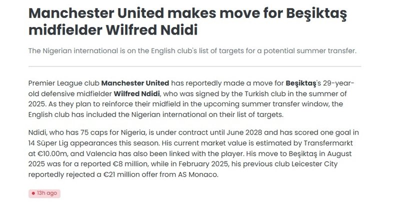 Premier Lig devi Manchester United’ın Beşiktaş’ın Nijeryalı yıldızı Wilfred Ndidi’ye talip olduğu öne sürüldü. Transferfeed’de yer alan habere nazaran, Manchester United’ın yanısıra İspanya La Liga grubu Valencia’nın 29 yaşındaki futbolcuyu takımına katmak istediği belirtildi.