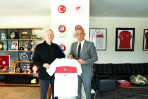 Riva Hasan Doğan Ulusal Ekipler Kamp ve Eğitim Tesisleri’nde gerçekleşen ziyaretin sonunda TFF Başkanı Hacıosmanoğlu, Göksel Gümüşdağ’a üzerinde isminin yazılı olduğu bir A Ulusal Kadro forması ikram etti.