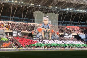 Trendyol 1. Lig’in 9. haftasında Özbelsan Sivasspor, Serikspor’u ağırlıyor. Sivas 4 Eylül Stadyumu’nda oynanan müsabaka öncesi manalı bir koreografi yapıldı. Sivassporlu taraftarının müsabaka öncesi yaptığı koreografi büyük alkış toplarken, koreografiyi izleyenler o anları cep telefonlarıyla kaydetti. Gazze’deki soykırıma sessiz kalmamak emeliyle yapılan koreografide ‘Dünya: 0 – Vicdan: 0’ yazısı yer aldı.