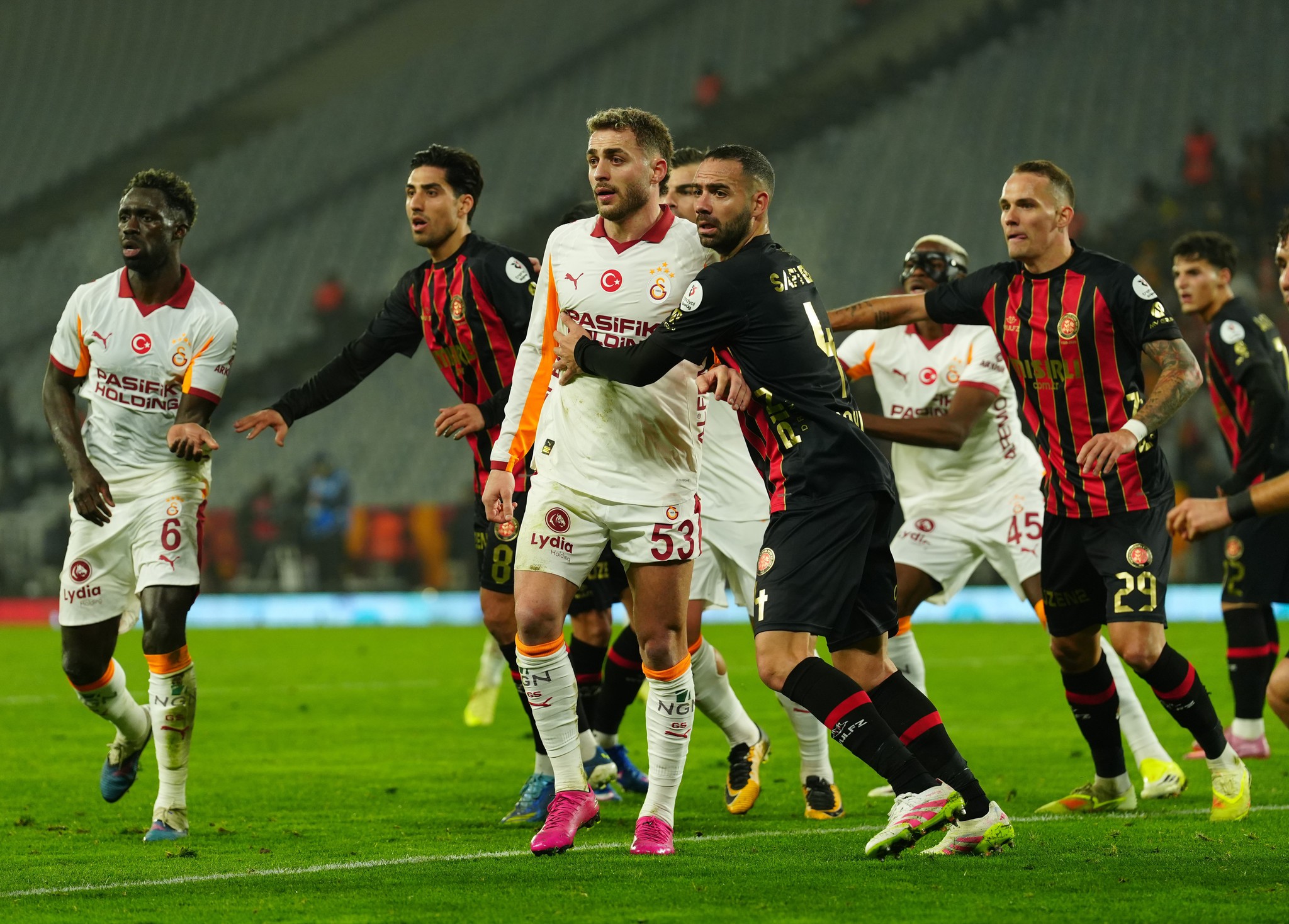Galatasaray yandan ve merkezden yüksek oynayarak Osimhen’i topla buluşturmak istedi. Karagümrük 4-4-2 ile bilhassa öndeki ikilinin savunma ortasına ve ardına yaptığı derin koşularla Galatasaray’ı zorladı.