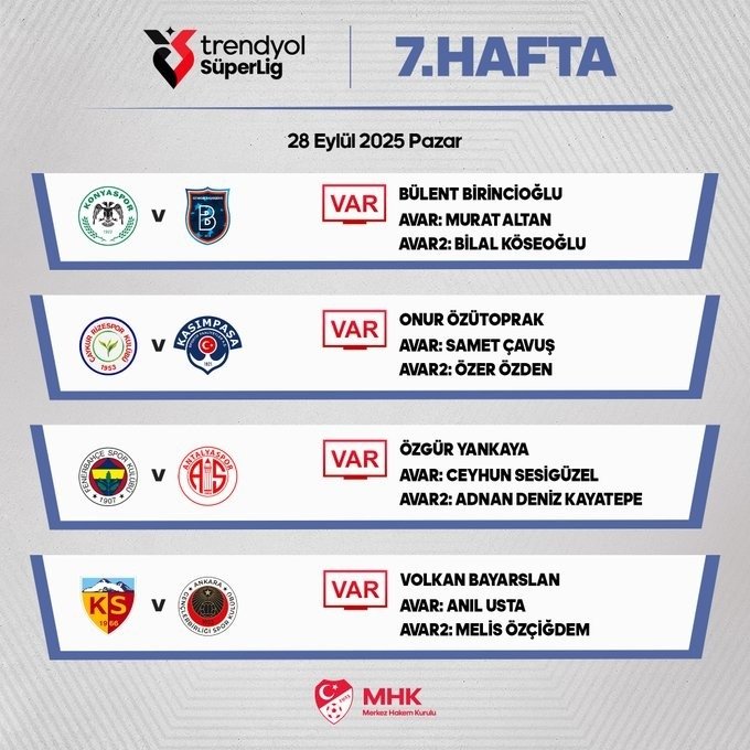 Merkez Hakem Şurası’nın açıklamasına nazaran, TÜMOSAN Konyaspor-RAMS Başakşehir maçının VAR hakemi Bülent Birincioğlu, Çaykur Rizespor-Kasımpaşa maçının VAR hakemi Onur Özütoprak, Fenerbahçe- Hesap.com Antalyaspor maçının VAR hakemi Özgür Yankaya ve Zecorner Kayserispor-Gençlerbirliği maçının VAR hakemi Volkan Bayaraslan oldu.