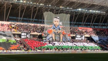 Trendyol 1. Lig’de Sivassporlu taraftarlar, Serikspor maçı öncesi Gazze’deki soykırıma sessiz kalmamak emeliyle koreografi yaptı.