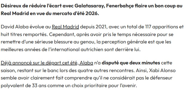 Haberde, Fenerbahçe’nin Avusturyalı oyuncunun deneyimi ve çok taraflılığından etkilendiği ve bu dönem sırf iki dakika müddet bulan 33 yaşındaki futbolcuyu takımına katmak istediği belirtildi. Alaba’nın da şampiyonluk için gayret eden bir takıma katılmayı tercih edebileceği söz edildi.